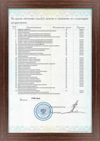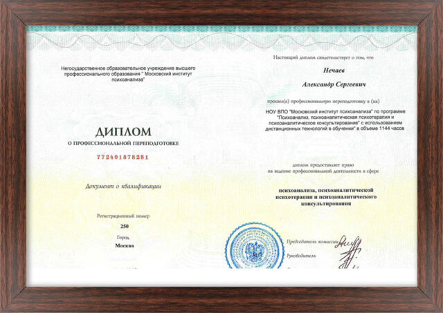 - Московский Институт Психоанализа — «Психоанализ, психоаналитическоя консультирование и психоаналитическая психотерапия взрослых». Квалификационная работа была написана по теме «Психоанализ депрессией»;