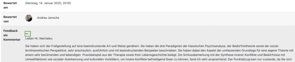| Участие в семинаре и супервизии „Испуг, клиническое наблюдение материнско-детских отношений“ (Вена, 2024): Dr. Veronika Garms: Психоаналитический психотерапевт для детей, подростков и пар; научный руководитель SIPsla (Итальянского общества психоаналитической психотерапии детства, подросткового возраста и пары); член Международной ассоциации Винникотта (IWA) |